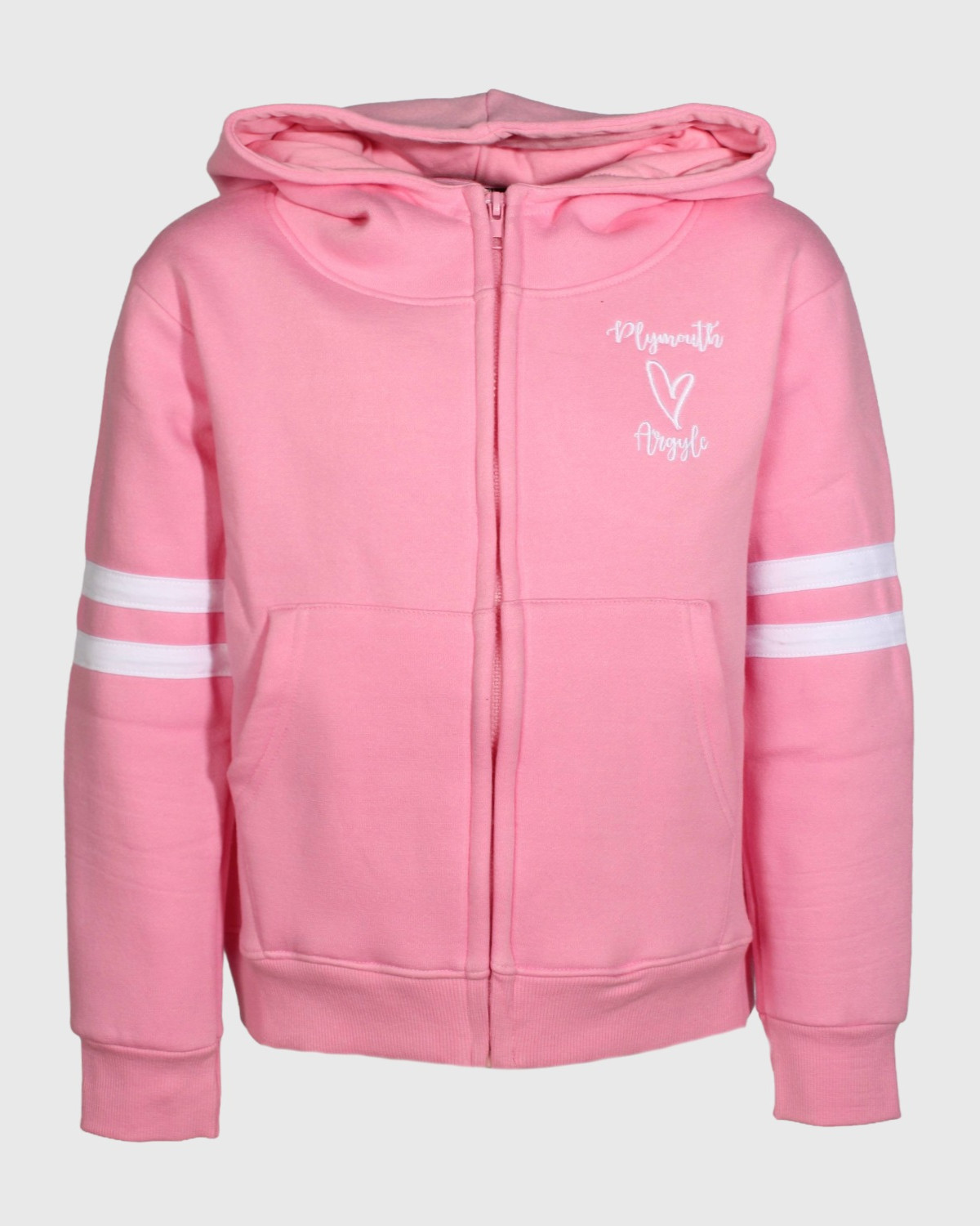 - Pink junior size hoody with white stripes on sleeves