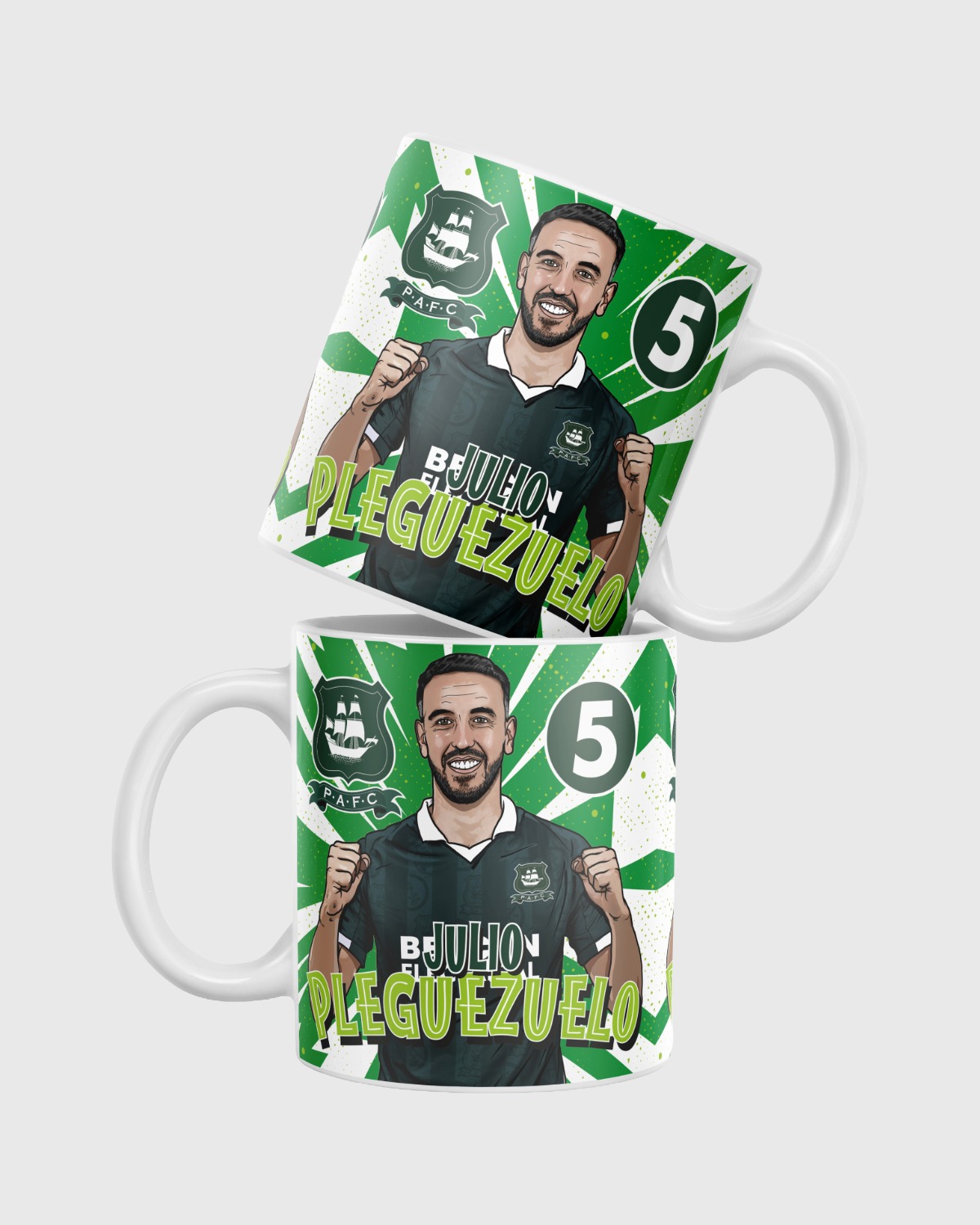 Show your support for Argyle’s defensive rock with the Julio Pleguezuelo Mug. Featuring a bold cartoon style graphic of the Spaniard in Argyle green, it’s the perfect way to enjoy your favourite hot drink while celebrating one of the Pilgrims’ key players.
